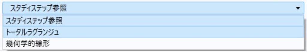 幾何学的非線形を扱う有限要素固体解析には、一般的に 2 種類の定式化方法があります。 1 つは Updated Lagrange(更新ラグランジュ)法で、計算途中の配置を積分領域として逐次更新しなが ら解きます。もう 1 つは Total Lagrange(トータルラグランジュ)法で、初期配置を積分領域として用 います。両者は等価的に同じ連続体問題を記述できます。図 1 に示すように、COMSOL Multiphysics ${ }^{\text {® }}$ では「トータルラグランジュ」、「幾何学的線形」といった選択肢が現れます。「トータルラグ ランジュ」は Total Lagrange 法を用いた幾何学的非線形解析となります。一方、「幾何学的線形」は幾何学的非線形を考慮しない微小変形解析を意味します。
