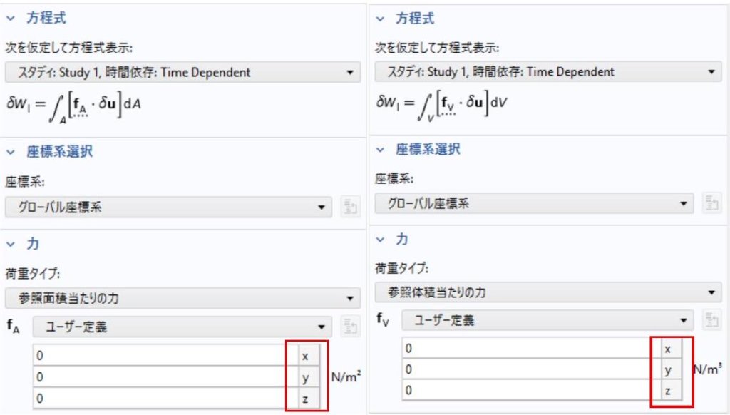 幾何学的非線形を考慮した有限要素法では、基本的にこの弱形式(積分方程式)を離散化しま す。ここで、 $\mathbf{f}_{A}^{0}$ と $\mathbf{f}_{V}^{0}$ は初期配置上で積分されますが、そのベクトル自体は現在配置に属するものです。 これについて、下図のように COMSOL Multiphysics ${ }^{®}$ の画面上でも現在配置に属する成分(小文字の x,y,z )を確認できます。