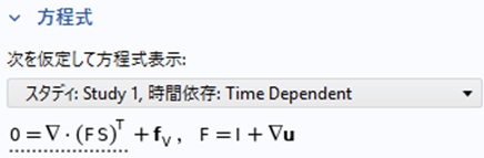 が得られます( $\boldsymbol{\nabla}_{\boldsymbol{X}} \boldsymbol{u} \equiv \boldsymbol{u} \otimes \boldsymbol{\nabla}_{\boldsymbol{X}}$ )。「トータルラグランジュ」を選択すると、以下の図に示すように、 COMSOL Multiphysics ${ }^{®}$ の画面上の方程式も幾何学的非線形を考慮した方程式に変わります。