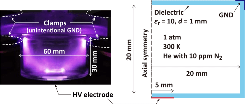 計算用のジオメトリは図1に示した2D軸対称モデルとし,実験系におおよそ一致するようにした.ガスはヘリウムと微量窒素(10 ppm),温度は300 K, 圧力は1 atmである.カソードは接地し,アノードは電圧が7 kVで印加される.