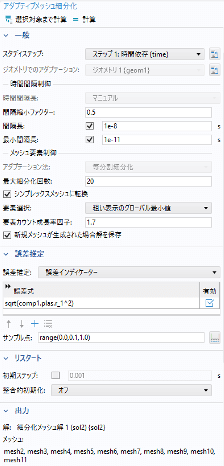 その際の指標となる量を誤差インディケーターに入力する.本モデルでは,イオン化レートが急峻に変化する部分を細かいメッシュにするために,sqrt(comp1.plas.r_1^2)とした.plas_r_1はイオン化反応(1)の反応レートである.二乗してルートをとるのは,plas.r_1が負になる可能性を考慮したためである.図3に示す間隔長は,メッシュを再構築する時間間隔である.