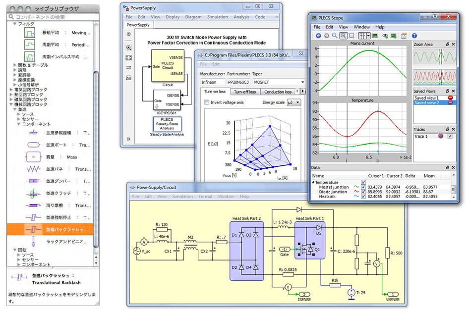 PLECS®は、制御を伴う、複雑な電気/電力システムを仮想空間上にモデリングし、シミュレーション(仮想実験)を実行するために開発された、「パワエレ・回路/システム・シミュレータ」です。 パワエレシステム開発の上流工程においては、システム全体の応答検証に焦点をあわせ、理想スイッチを用いることで、素早くシミュレーションを実行します。また、下流工程において重要となる、素子の寄生効果等の詳細特性も考慮することが可能です。 PLECSは、非常にシンプルなGUIを採用しており、直感的な操作で、簡単にパワエレシステムを構築します。 また、理想スイッチを用いたスイッチング現象の取扱いによって、高速かつロバストなパワエレ回路シミュレーションを実行することが可能です。 シンプルなチョッパ回路、または複雑な電動機回路といったシミュレーション対象のモデリング難易度に関わらず、必要とする結果を、素早く手に入れることが可能なパワフルなシミュレーションツールです。