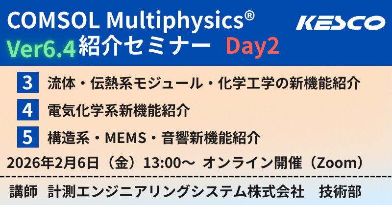 このVer6.4紹介セミナーは、2026年2月5日と6日の2回に分けて行います。 DAY1は、COMSOL Multiphysics® Ver6.4のコア機能・多目的モジュール及び、電磁気・半導体・粒子追跡・プラズマ・電気放電分野における重要なバージョンアップ情報を2部構成でご紹介します。ぜひご参加ください。 DAY2は、流体・伝熱・化学工学、電気化学全般、そして構造・MEMS・音響の3部構成で行います。ぜひご参加ください。