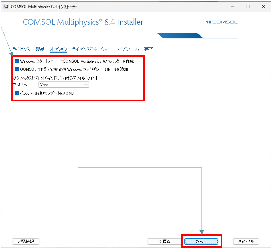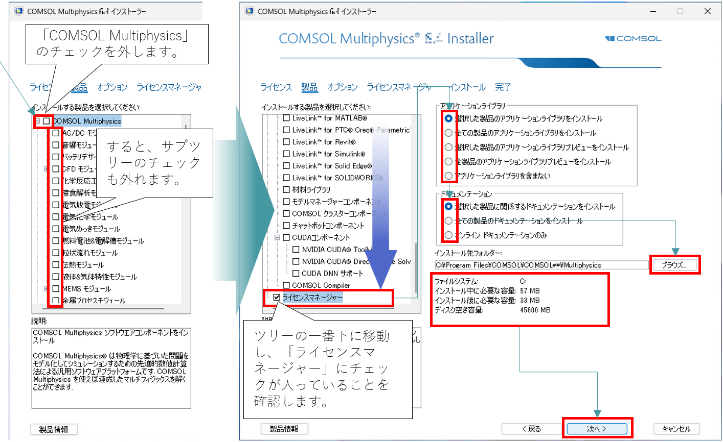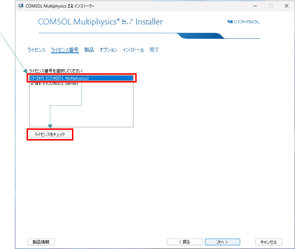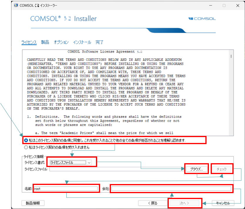 【3.4】 “COMSOL インストーラー”のGUI画面で、下記操作を実行します。
