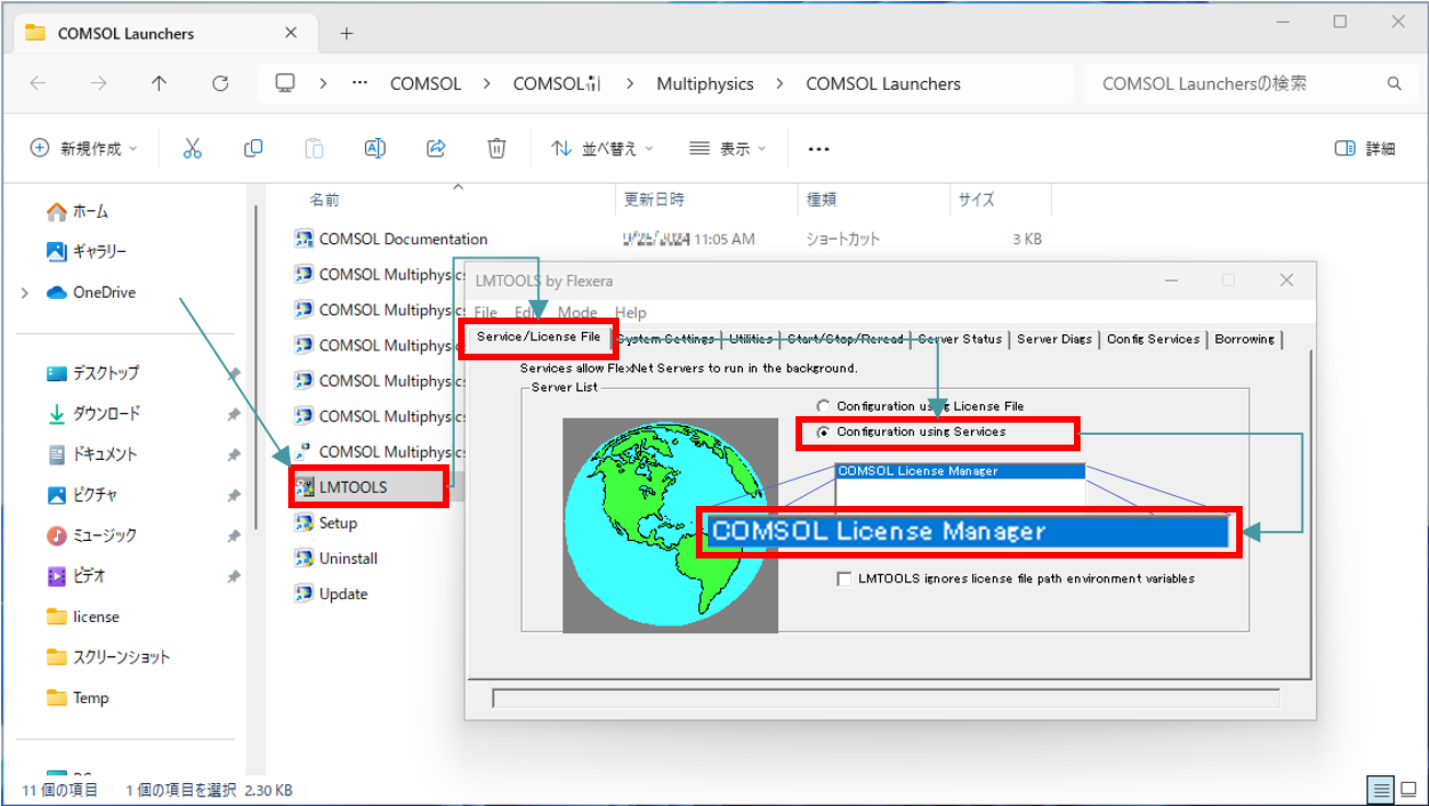 ##はセットアップ済みのバージョンの数値に読み替えます。 - フォルダー内が表示されますので、この中にあるLMTOOLSを起動し、[Service/License File]タブをアクティブにします。この画面の[Configuration using Services/サービスを使用した環境設定]ボタンを選択し、下段の「COMSOL License Manager」をアクティブにします。