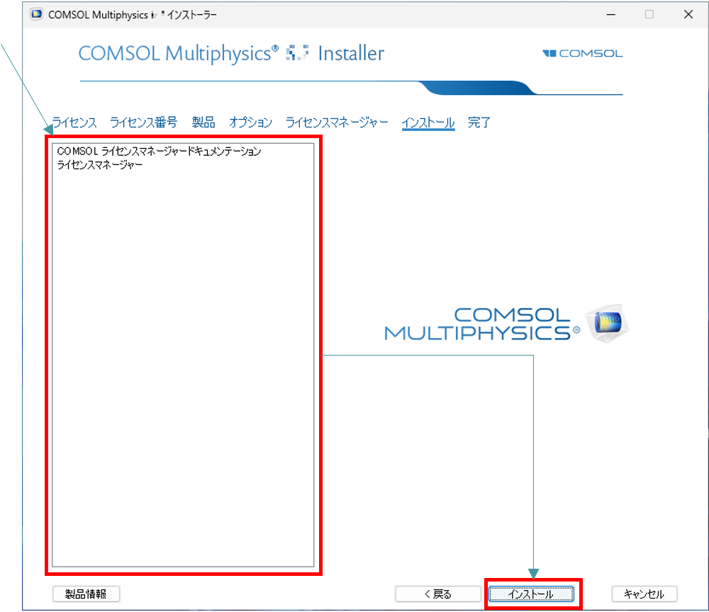 【3.10】 “インストール”画面では、COMSOLライセンスマネージャードキュメンテーションとライセンスマネージャーがリストされます。確認しましたら、[インストール]ボタンを押下し、インストールを実行します。