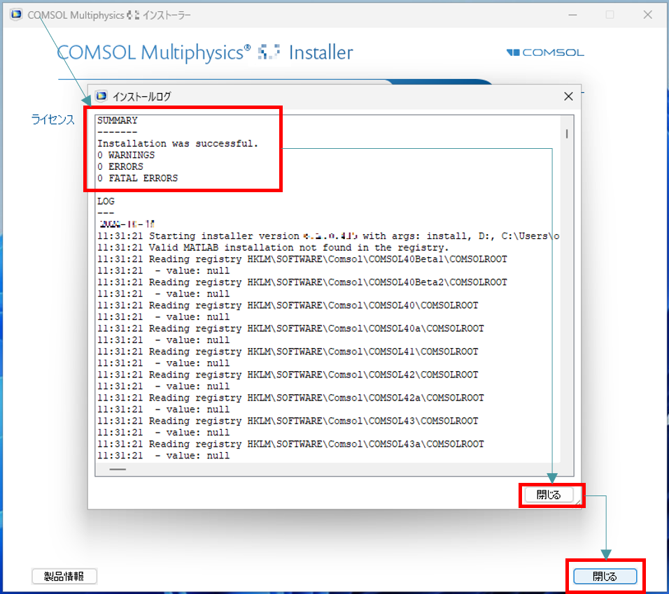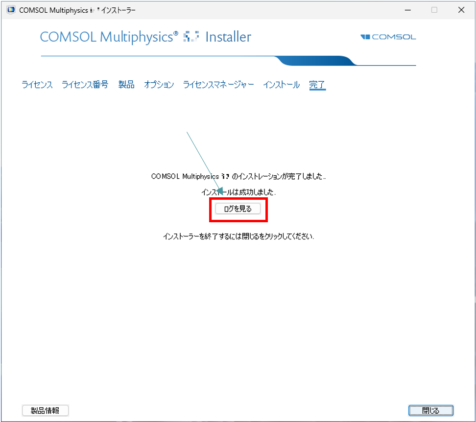 - インストールログの[閉じる]ボタンをクリックした後、COMSOL Multiphysics® インストーラーの[閉じる]ボタンをクリックします。
