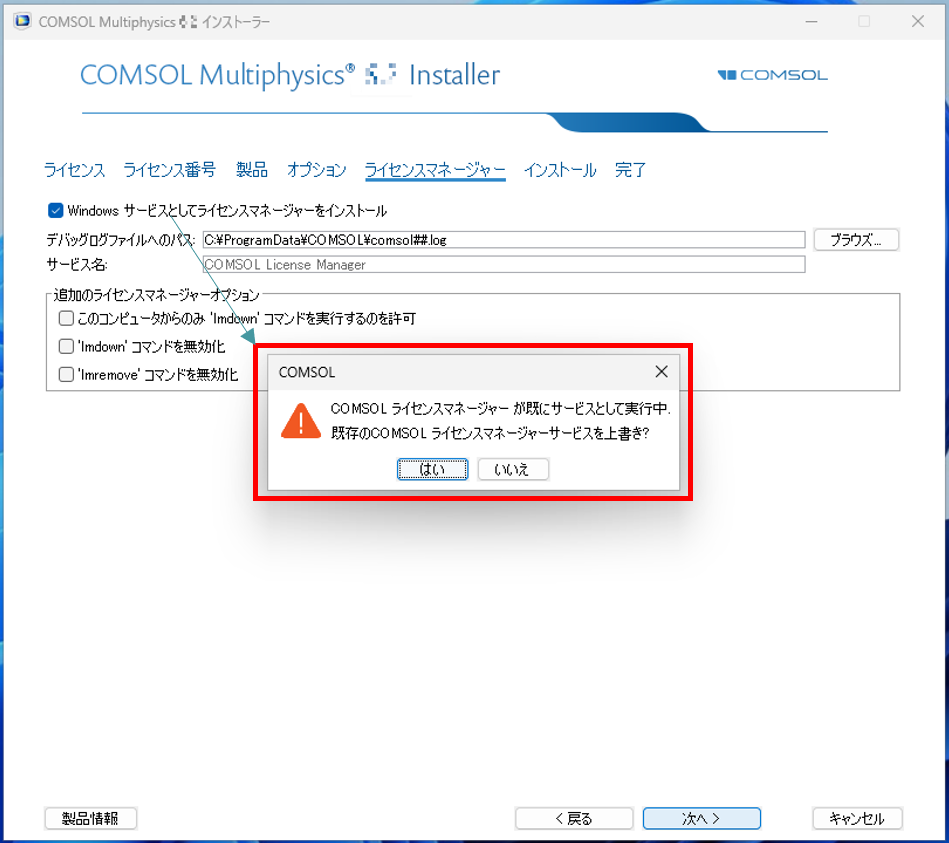 「Windowsサービスとしてライセンスマネージャーをインストール」にチェックを入れておりますので、「COMSOL License Manager」サービスをインストールします。既に実行している同名サービスがありますと、上書きするか否かを確認するための画面が表示されます。[注意3]