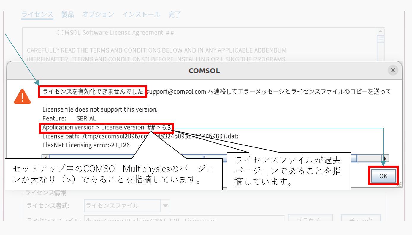 - 指定されたバージョンよりも新しいバージョン用COMSOLライセンスマネージャーのサービスがセットアップされている場合: