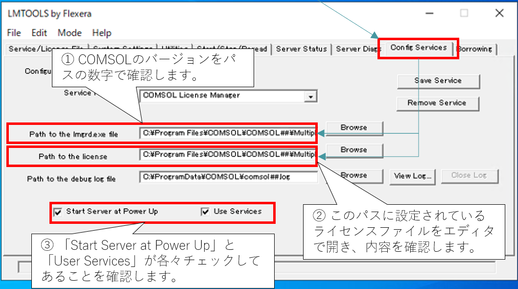 - COMSOLのバージョン(二桁の数字)を「Path to the lmgrd.exe file」に設定されているパスの数字(例:COMSOL##)で確認します。(注意1)