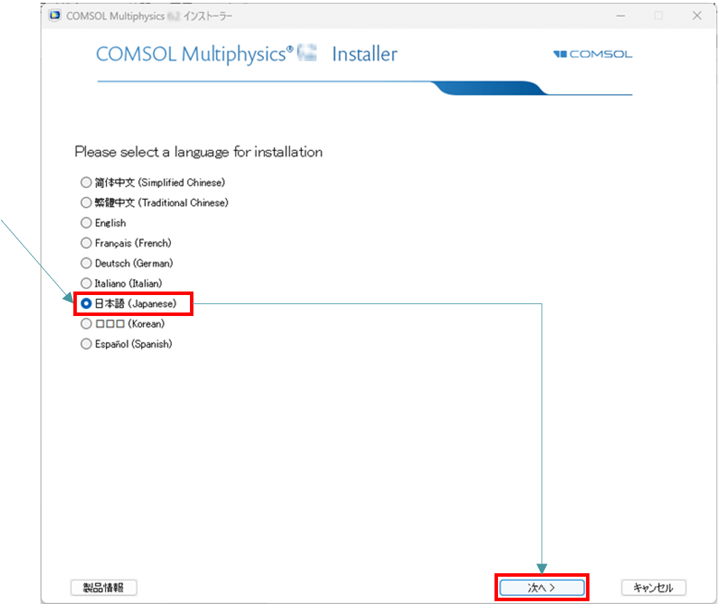 【1.3】 “COMSOL インストーラー”のGUI画面が表示されます。ここでは、下記操作を実行します。