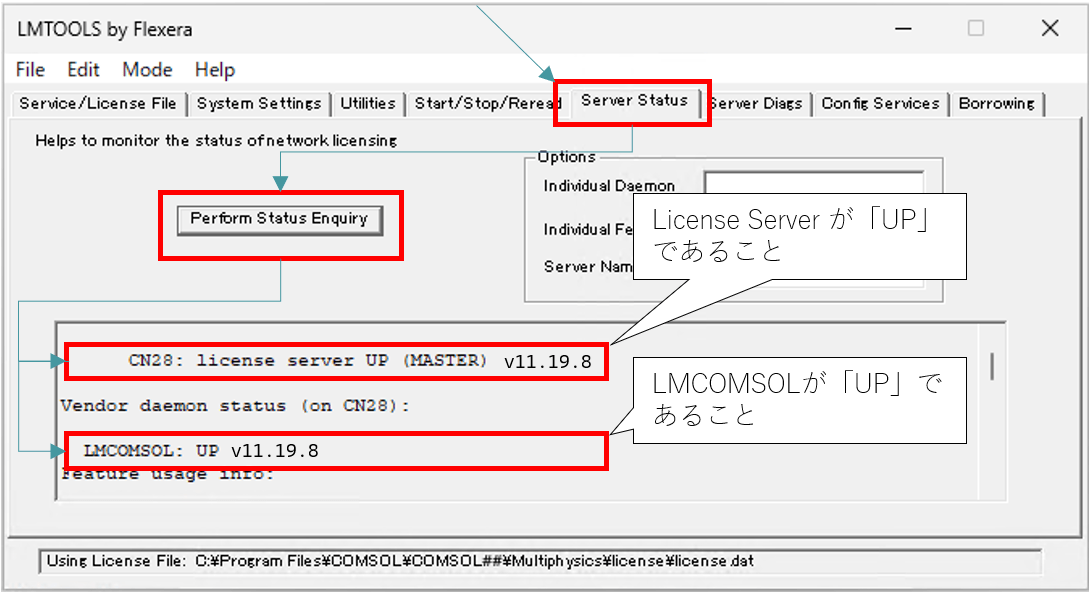 【4.2】別の確認方法として、LMTOOLSの[Server Status]タブに移動し、[Perform Status Enquiry]ボタンを押下します。すると、画面下にCOMSOLライセンスマネージャーの状態が出力されます。出力結果を下方向にスクロールし、10行目と14行目にそれぞれ「UP」と記載されておれば、ライセンスマネージャーが実行中であると判断します。(注意1)
