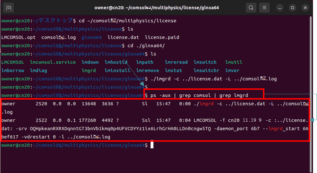 コマンド名:$ ps -aux | grep comsol | grep lmgrd